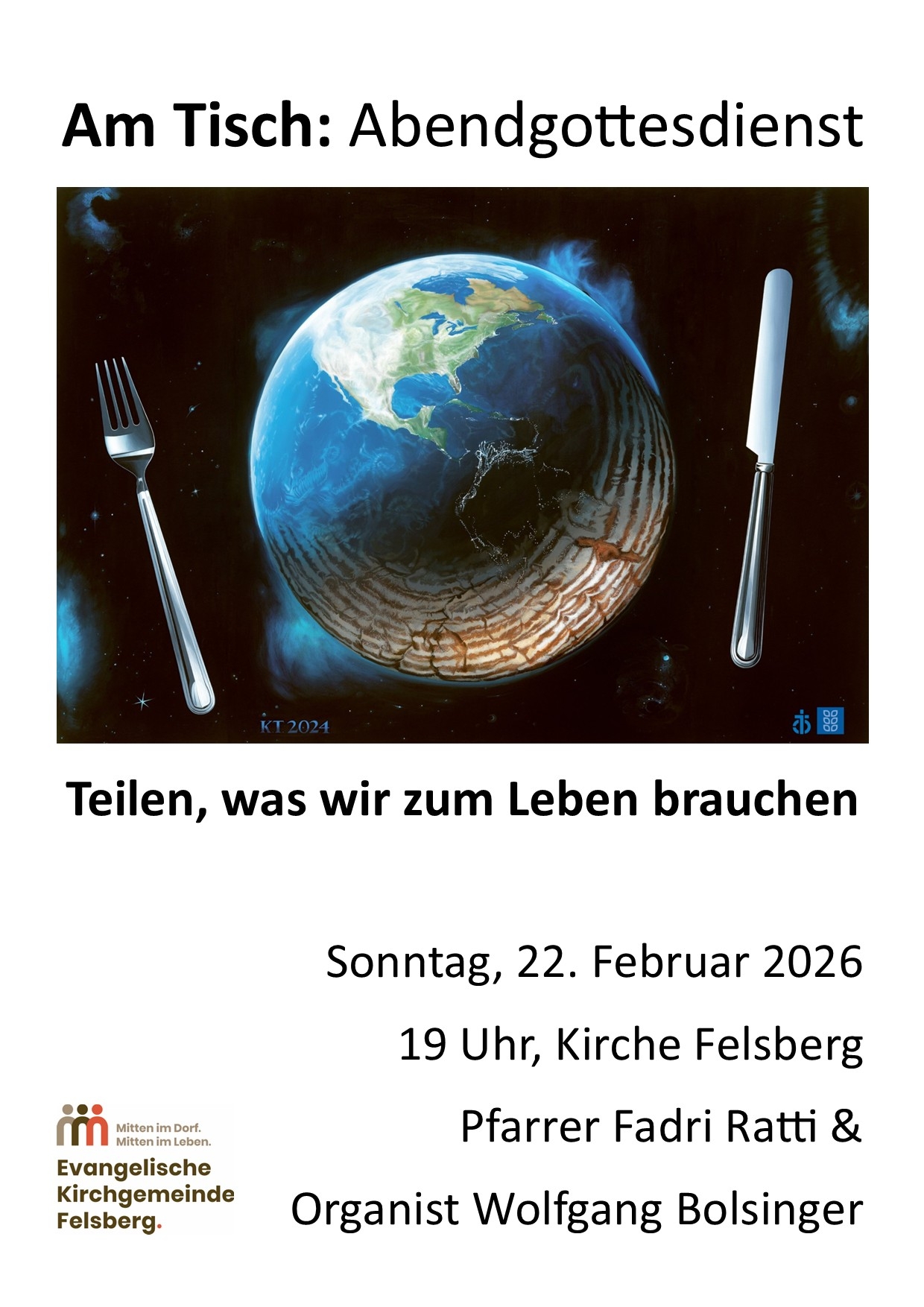 Teilen, was Gott uns gibt. Am Aschermittwoch, 18. Februar beginnt die Fasten-, bzw. Passionszeit. Pfarrerr. Fadri Ratti und Organist Wolfgang Bolsinger greifen das diesjährige Hungertuch auf.
